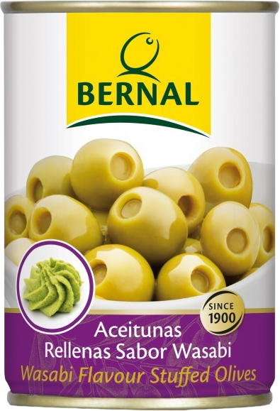 Зеленые оливки среднего размера, фаршированные пикантным соусом васаби. Этот экзотический продукт с пряным вкусом - прекрасная закуска и замечательное дополнение к самым разнообразным коктейлям и салатам.